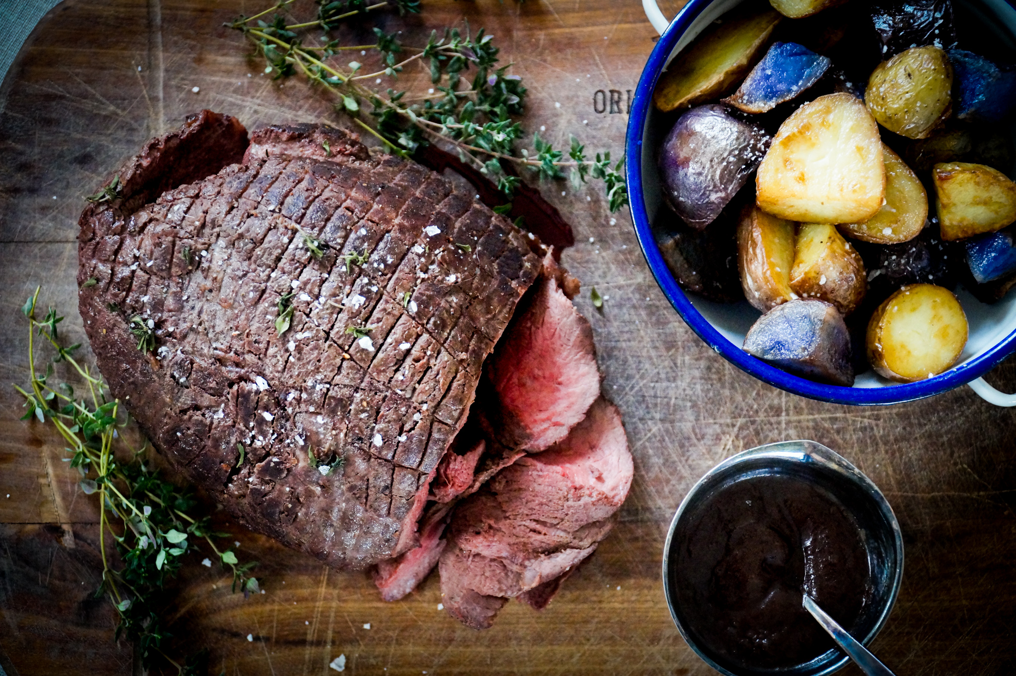 2. Haal de rollade uit de pan en doe over in een ovenschaal. Bak 35-45 minuten of tot de kerntemperatuur 55 graden heeft bereikt. Haal uit de oven en laat 15 minuten rusten onder aluminiumfolie.