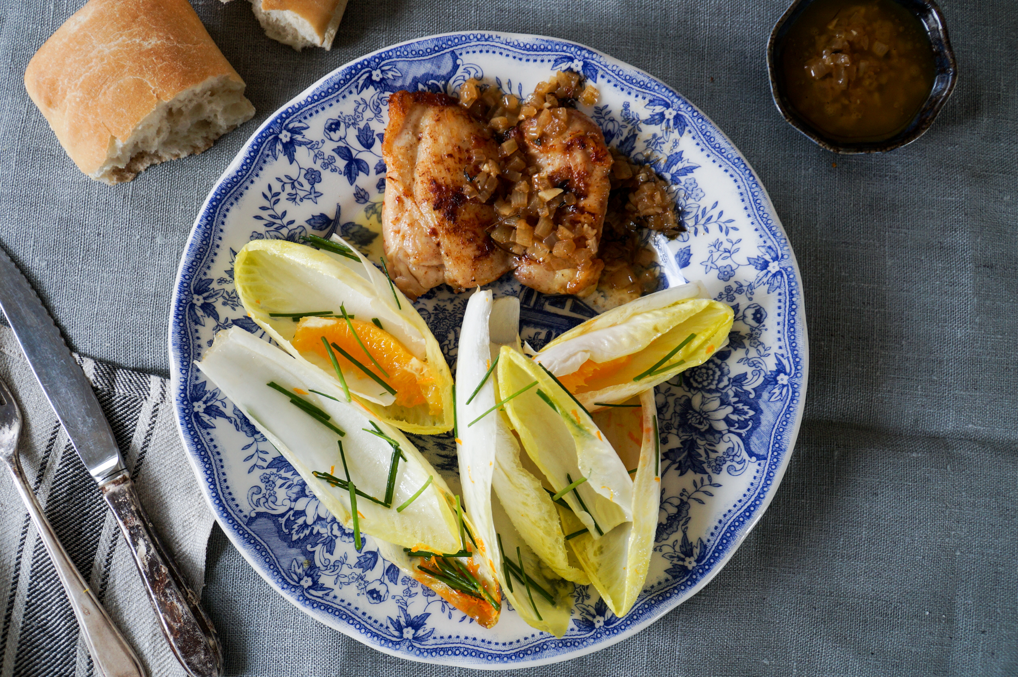 Kippendij met witlofsalade, pansaus en zuurdesembrood