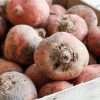 - Snijd de biet in 4 mooie stukken. Plaats de biet als eerste op een bord op de crème fraîche. Decoreer de biet met de cornetjes van ramanas, chioggia biet pickles en het venkelkruid.