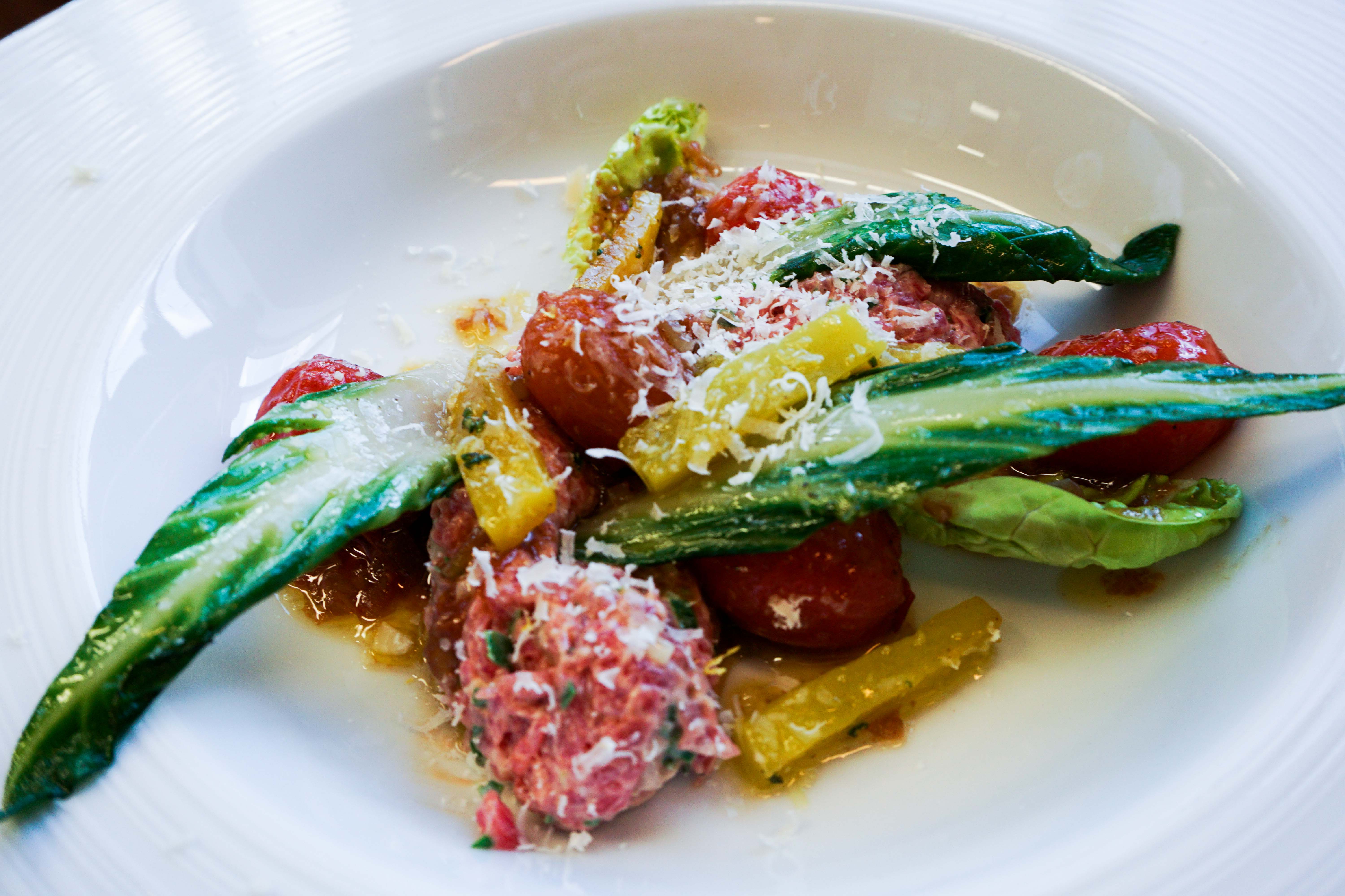 - Maak het bord op: ben met wat frisse sla en maak daarop een quenelle van de tartaar met twee lepels. Verdeel er wat tomaten bij met de gepofte paprika ernaast en druppel de marinade erover. Leg daar wat paksoi overheen om hoogte in het gerecht te brengen. Schaaf er nog wat Parmezaanse kaas over en bon appétit!