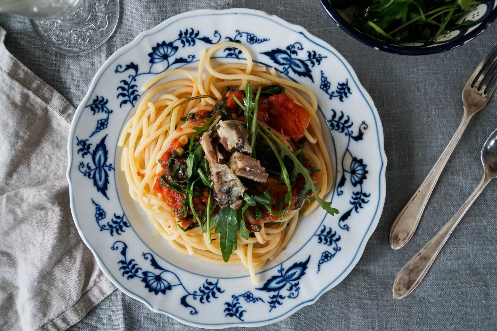 - Roer de pasta en de sardientjes door de saus en breng op smaak met zout en peper.